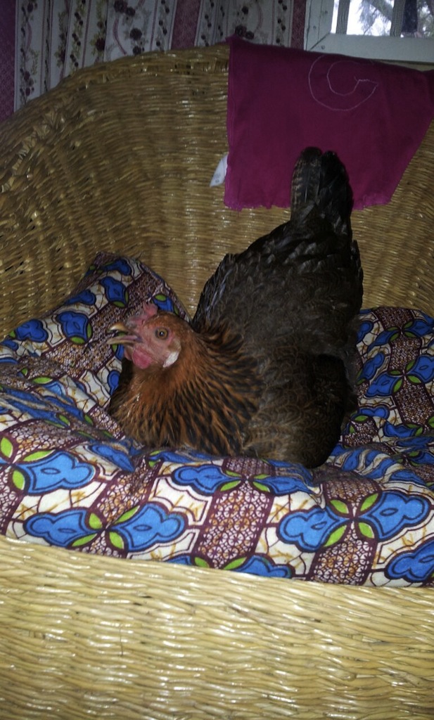 Dörte, die fast täglich zuverlässig ein Ei liefert, ist zu einer kleinen Diva geworden. Anfangs hat ihr der Karton mit Heu auf der Veranda gereicht, um ihr Ei zu legen. Doch seit geraumer Zeit versucht sie tatsächlich alle zwei Tage ins Wohnzimmer zu kommen, um auf einem unserer Sessel Platz zu nehmen. Was ihr auch manchmal gelingt, denn wenn Jan und ich im Krankenhaus sind, läßt Frida Dörte gerne ins Wohnzimmer. Aber: es ist ein köstliches Bild, wenn Dörte in „ihrem“ Sessel sitzt.